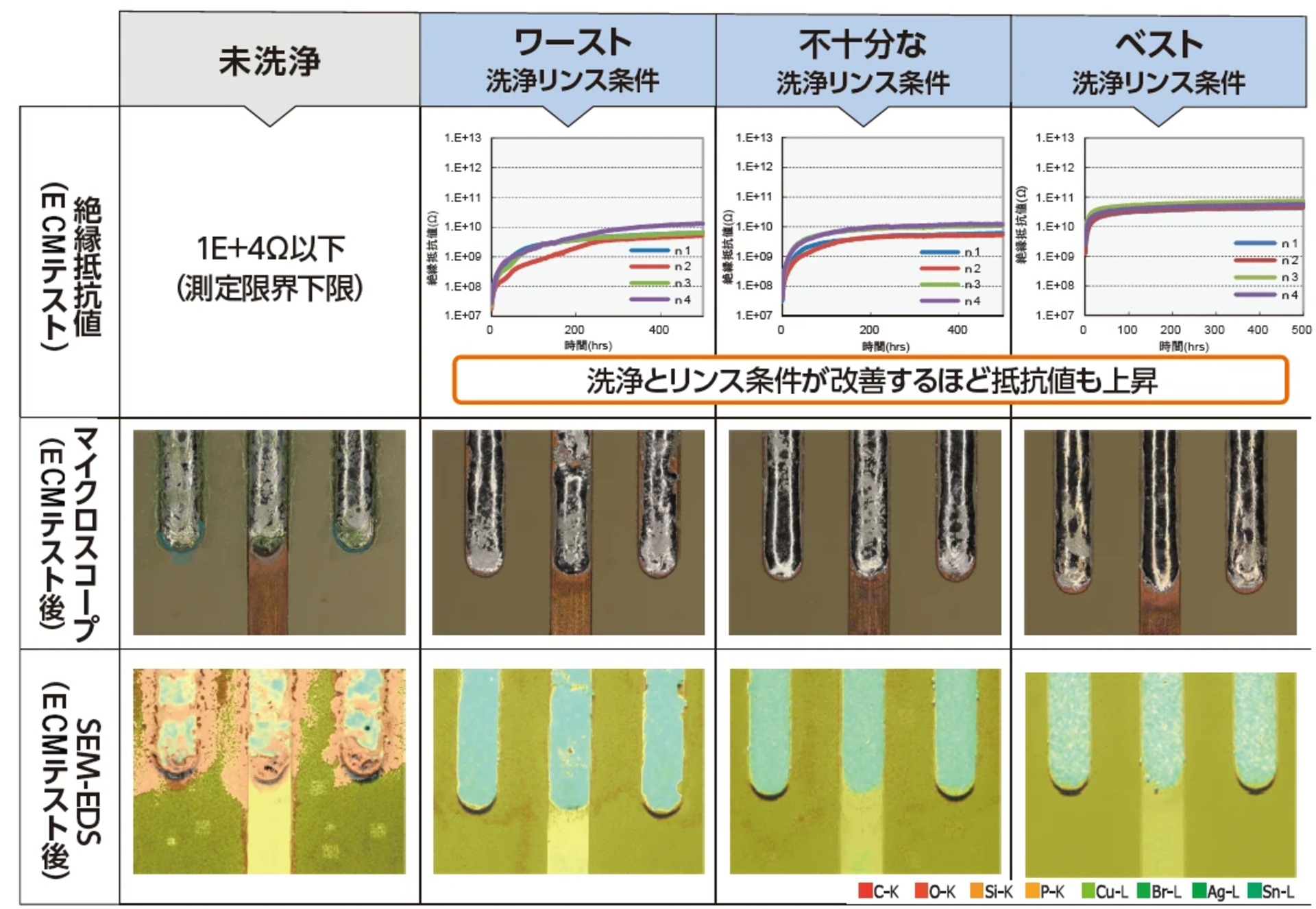 よって今回の弘輝様との共同研究では、洗浄後のイオン残渣の「量」だけでなく、形態変化や抵抗値なども含め総括的な影響を調査しました。