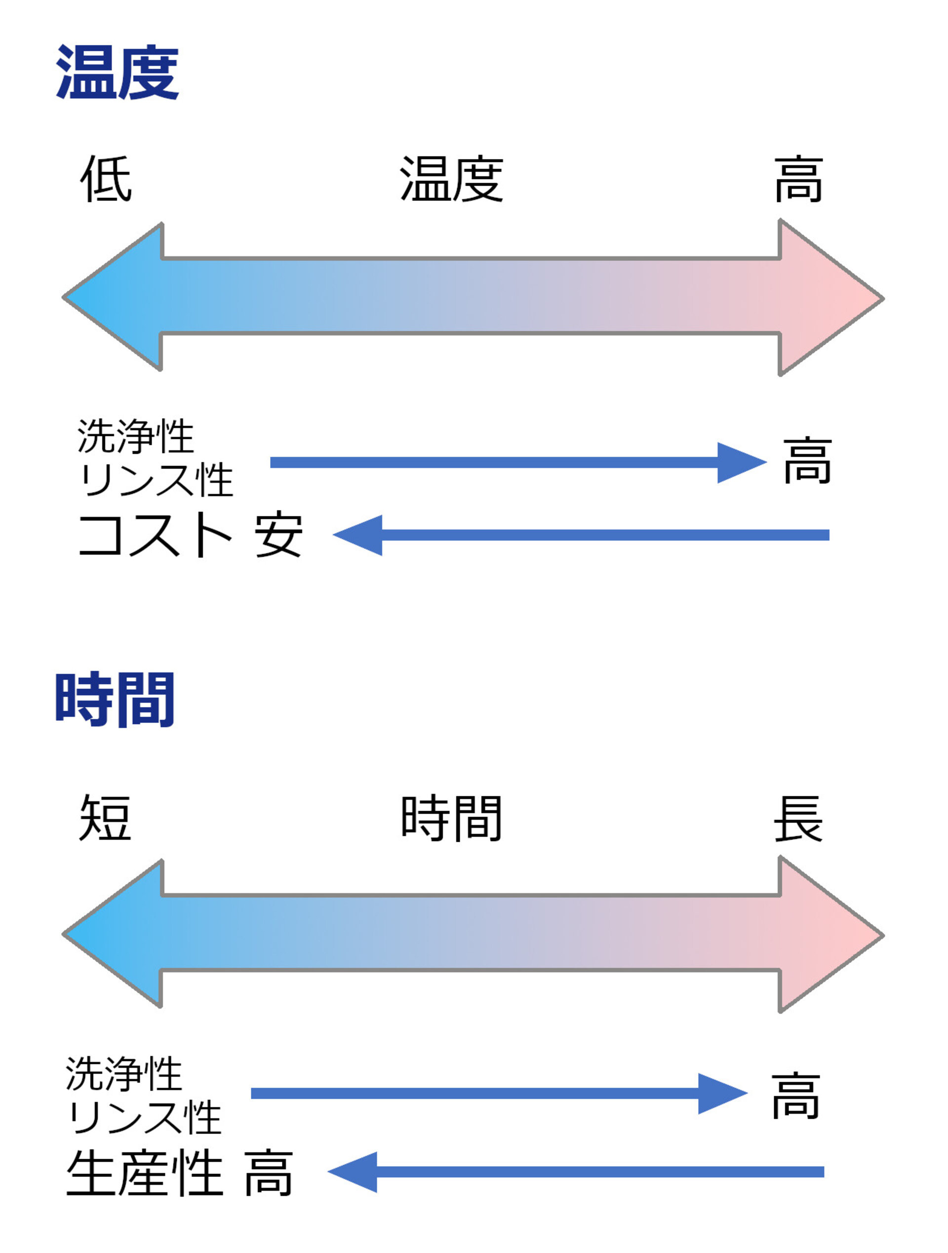 温度・・・動熱費との兼ね合い / 安全面(洗浄剤が危険物の場合、安全面の観点から加温が制限される)