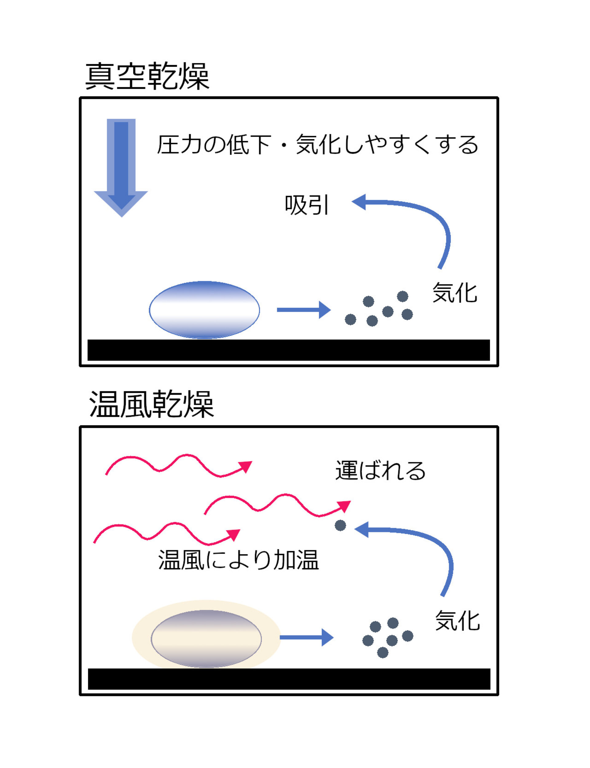 乾燥手法は真空乾燥と温風乾燥の2種に大別されます。